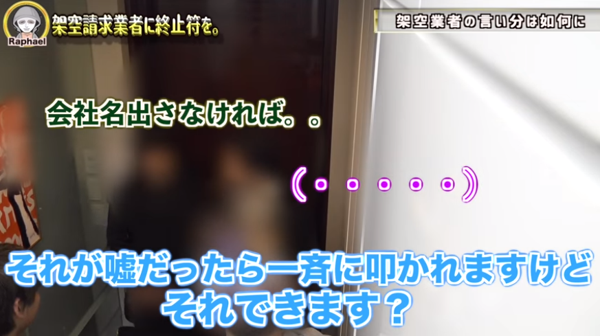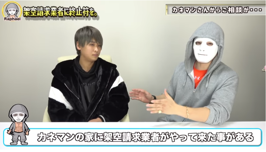 2019年2月21日に投稿された動画「【対決】架空請求業者が家に来た!【Raphael】」でラファエルとカネマンが架空請求業者と直接対決。