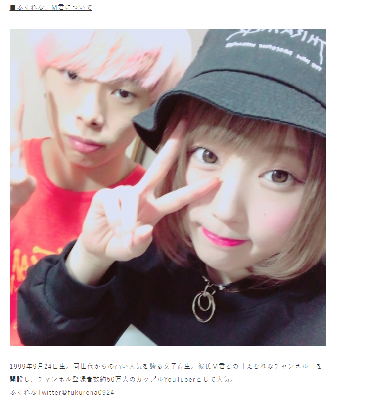 ふくれなの彼氏であるM君については長らく事務所は無所属との噂があったが、現在はえむれなカップルとしての仕事が急激に増加したためふくれなと同じ事務所に所属していることが考えられるが・・・?