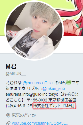 現在、M君のTwitterのプロフィール欄に記載されているファンレター・プレゼントの宛先はふくれなと同じく株式会社ギルド。
