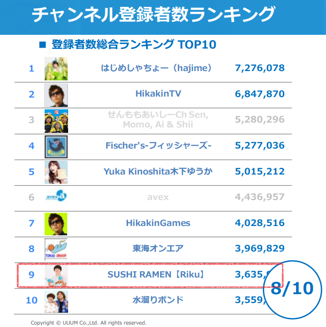 その中にある「チャンネル登録者数ランキング」にすしらーめんりくの名前が「UUUM所属YouTuber」として掲載されているのだ。