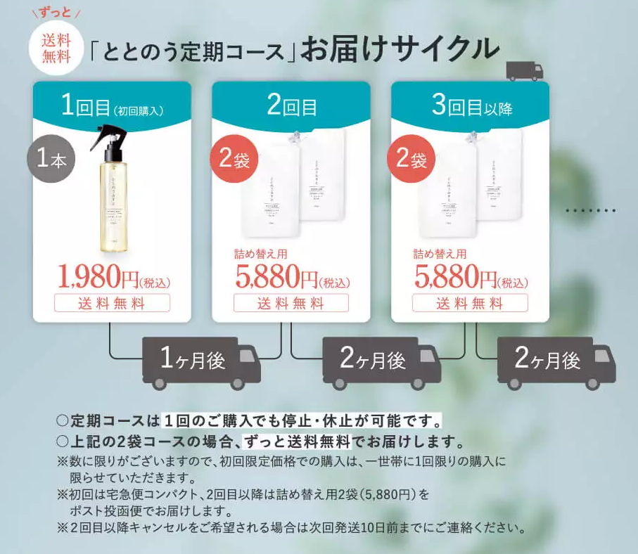そして回数縛りはなく1度目のお届けから自由に解約をすることができる上、肌に合わなかったり商品に満足することができなかった場合は30日間の返金保証を受けることもできるので「高いから買うのに勇気がいる・・・」と不安を感じている方も是非ととのうみすとのお試しを♪