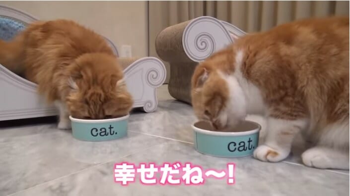 爪とぎも出来てベッドにもなるカリカリーナに対し、最初興味がなさそうだったものの、最終的にはまるおももふこも気に入ったようだった。その後はティファニーの猫用食器を使って、ヒカキンが2匹にご馳走を振る舞っている。