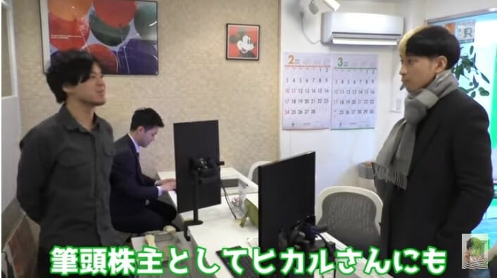 今回の動画内容は、以前ヒカルが高橋さんと約束した「会社の株を10%互いに譲渡する」を果たすべく、株を貰う予定の不動産店に訪問し譲渡契約を結ぶというもの。