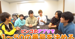 今回の企画は、スカイピースが持ち込んだビンゴのアプリでランダムに数字を出しそれを参考に五十音の文字で連絡先にいる人にいきなり企画説明禁止で電話するという企画である。