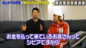 カジサックが宮迫さんにこれだけ売れているにも関わらず毎月舞台に立っている理由について尋ねると「テレビ観覧に来る人はみんな味方なのでお金を払って見に来ているシビアなお客さんの前で笑いを取ることは定期的にやっておいた方がいい」と語った。