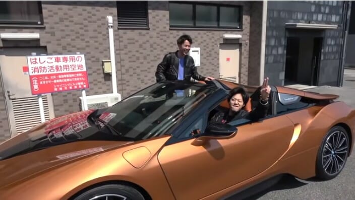 動画冒頭、待っているりょうのもとに2000万円を超える高級車に乗ったてつやが登場し、サプライズで新車披露。