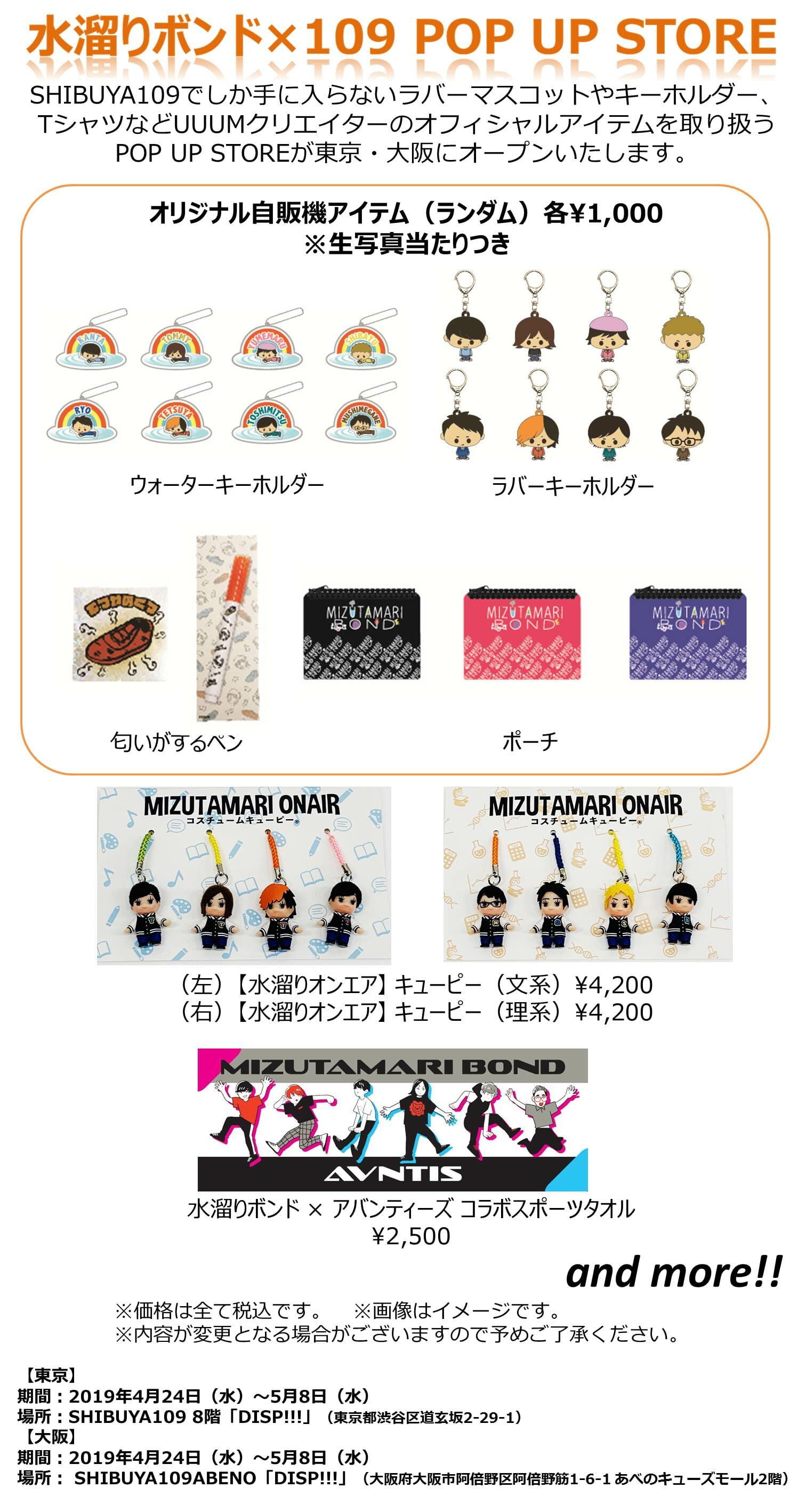 SHIBUYA109(渋谷・阿倍野両店)内に、水溜りボンドのポップアップストアが展開され、イベントでは販売されたことのないようなデザインのグッズが販売されるとのこと