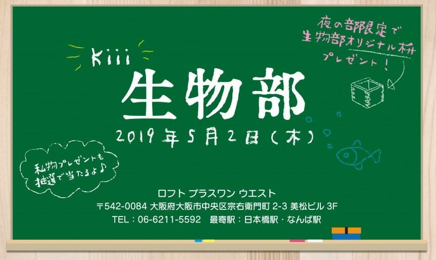 2019年5月2日、きまぐれクック・渥美拓馬・八丈冒険団・ちゃんねる鰐による合同トークイベント「Kiii生物部」が大阪で開催された。