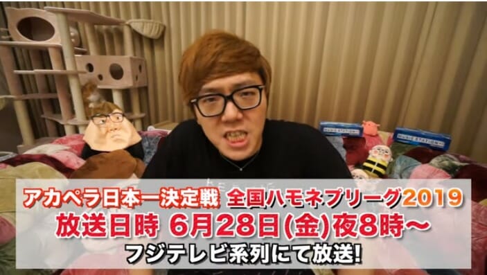 今回ヒカキンが出演報告した「全国ハモネプリーグ2019(通称ハモネプ)」は楽器を使わずに声だけでアカペラ日本一を競うテレビ番組だ。