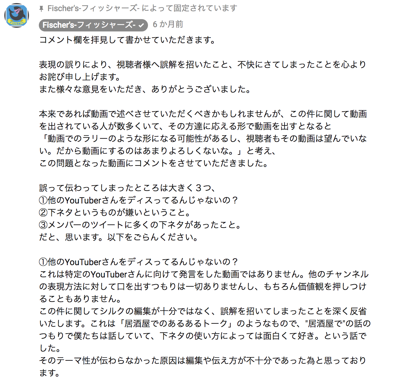 ②投稿当初は炎上していなかったが、後日当時過激派の動画がウリだった禁断ボーイズが「フィッシャーズさん、本当に下ネタ嫌いなんですか?」とフィッシャーズを名指しした動画を投稿(現在は非公開)を投稿したことにより事態は一転。
