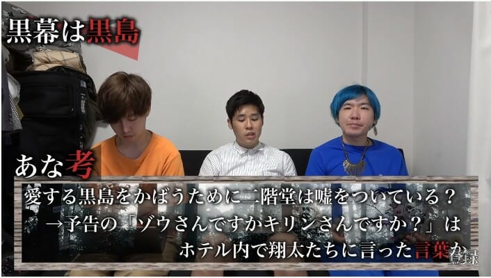 わざわざ音声加工をしてまで検証した、沈黙ヒストリーTVのたにやん。二階堂は黒幕ではなく、黒島をかばっている、本当の黒幕が黒島なのか確かめている、という考察に至ったようだ。