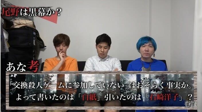 - ・しかし尾野に問い詰めると「犯人は黒島」の1点張り。更に「交換殺人ゲームに参加していない」と言い出す尾野。