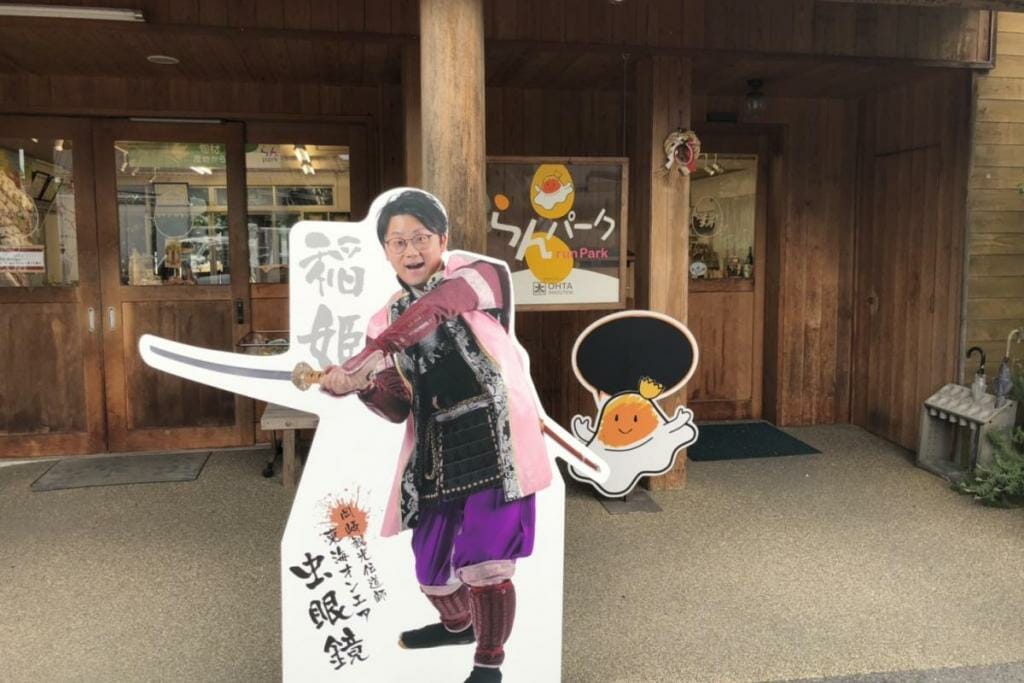 ゆめまるパネルが素振り中の「カクキュー八丁味噌の郷」