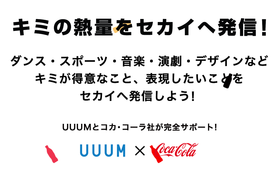 2020年に開催される東京オリンピックに向け、10月1日に日本コカ・コーラ株式会社が運営するYouTubeチャンネル「teamcocacola」を盛り上げるためヒカキン・はじめしゃちょーなど人気YouTuberが所属するUUUMと共同で「TEAM Coca-Colaパフォーマー&クリエイターオーディション」を開催スタートした。