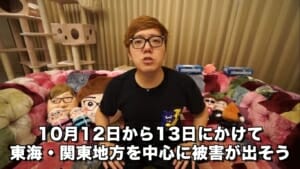 2019年10月11日、ヒカキンが「【台風19号】今すべきこと、誰でも出来る準備を紹介!【家族の命を守ろう】」を公開。ヒカキンが台風19号について備えておいた方が良いことについて説明をした。