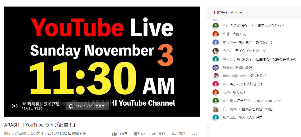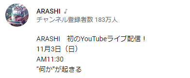 2019年11月3日(日)午前11時30分から、嵐がYouTubeライブ配信を開始