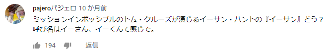 また「イーサン」という名前の由来は大人気映画シリーズ「ミッション・インポッシブル」でトム・クルーズが演じている「イーサン・ハント」から来ている(コメント欄に寄せられたファンにより命名)ことから、本名とは全く繋がりはなさそうだ。