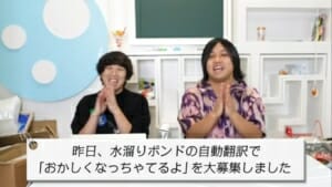 昨年自動翻訳の動画企画を行った水溜りボンド。結構面白かったということで今年も自動翻訳の動画企画を開催。ツイッターで「水溜りボンドの自動翻訳で“おかしくなっちゃてるよ”を大募集。トレンド入りになるほどの沢山のコメントが寄せられた。特に面白かったものをトミーとカンタがピックアップし読み上げていった。