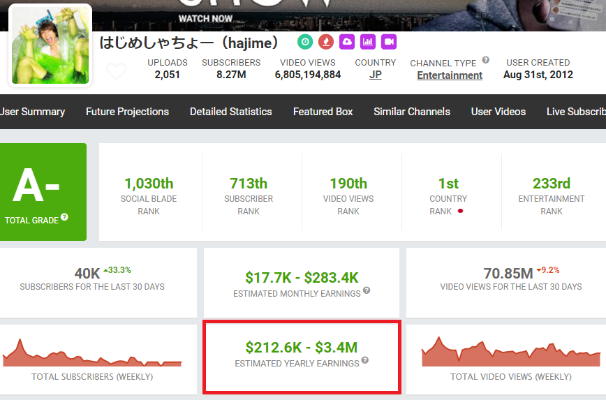タイトルの「年収6億円」にかなり近い数字が出ていることから、もしかするとはじめしゃちょーの噂されている年収の主なソースは「ソーシャルブレードが予想する年収の最高額」であるのかもしれない。
