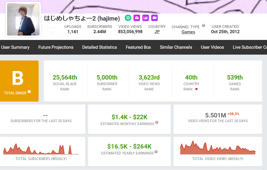 はじめしゃちょーのチャンネルをソーシャルブレードで検索した結果がコチラ↓