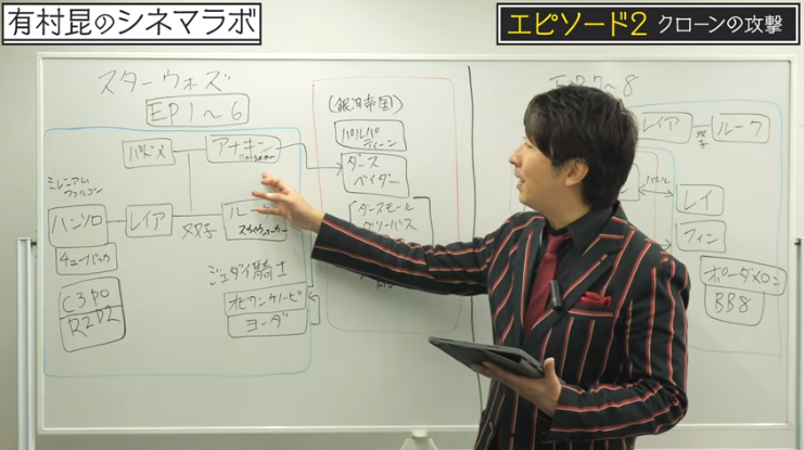 また、解説にはホワイトボードを活用しており、登場人物の名前や複雑な関係などで混乱しにくい、スターウォーズ初心者でも非常にわかりやすい優しい内容となっている。