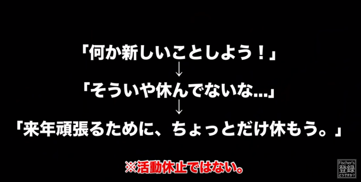 2013年よりほぼ休み無く動画投稿を続けてきたフィッシャーズ。一時期は1日に動画を2本投稿していたこもあるほど動画活動に積極的に取り組んできたため、今回7日という(本人たちにとっては)長い休暇は少し不安である模様。