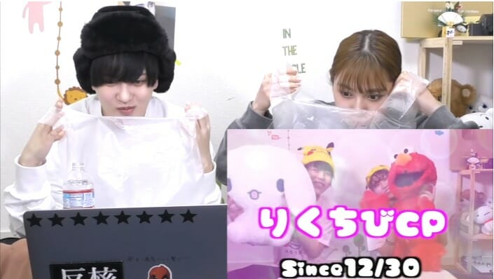 ほりえりくとくろちびが、2人でいかにもカップルチャンネルっぽいやり取りをしている動画を、笑わないように水を口に含みながら視聴する古川優香とやっぴ。