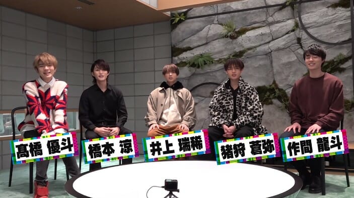 動画冒頭、しばらくの間メンバーのうち3人で動画を撮影していたHiHi Jetsが、今回の動画より「5人での動画を再開する」ことを報告した。