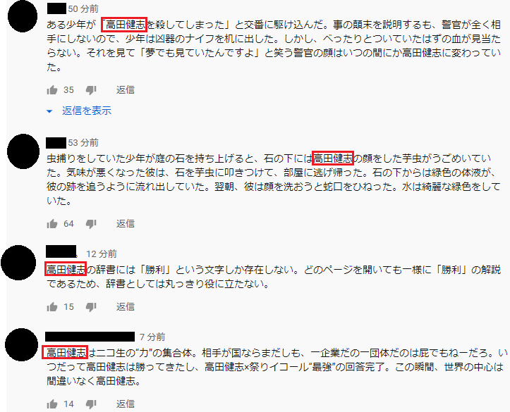 復帰動画を公開して暫くの間はマホトの復帰に関する喜びのコメントや意見などが多数寄せられていたコメント欄だったのだが、翌日18日に何故かコメント欄はマホトに関する書き込みは一切なく「高田健志」という謎の人物のエピソードで埋め尽くされることに。