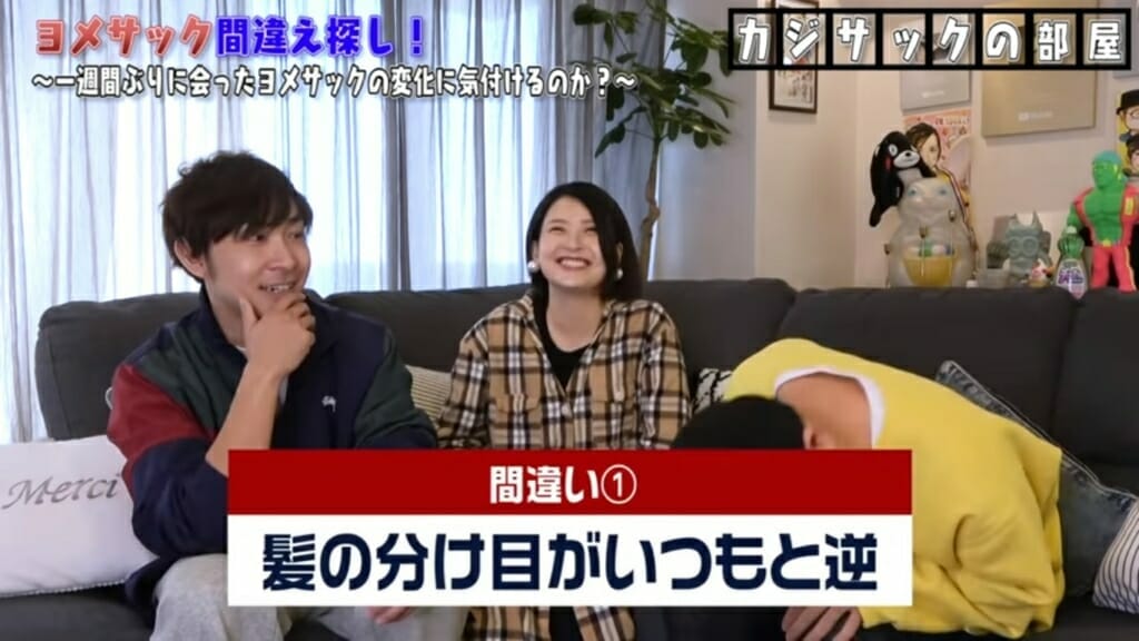 髪の分け目が逆、カラーコンタクトやホクロをつけている、など、5つの普段と違う「間違い」を用意した嫁サック。カジサックが帰宅すると早々にカラコンを言い当てるが、惜しくも2つの「間違い」には気づかなかった。
