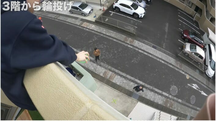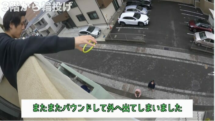 今回の動画では「3階の高さから○○する」シリーズ最新企画として、「3階の高さから落下型の輪投げをする」ことに。