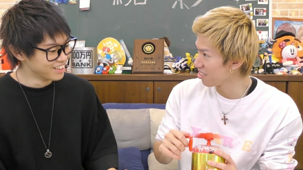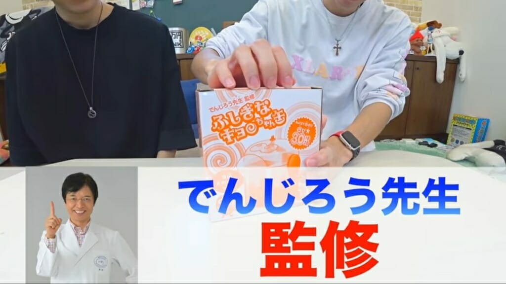 スカイピースの手元に届いたキョロちゃんの缶はでんじろう先生監修の元、30種類の遊び方がある。遊び方の紹介をしながら実際に遊ぶスカイピース。2人は遊んでいるうちに独自の遊び方を考案。考案した遊び方も全力で実践した。