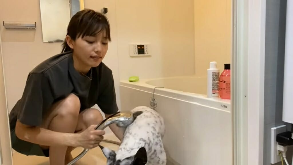 帰宅してからはアムをお風呂に入れる様子までを撮影している。川口春奈は「お風呂は戦場」と言いながらも慣れた手付きでアムを洗っていた。