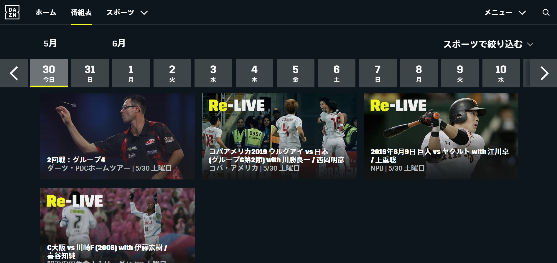 DAZNの番組表は今日の予定や再放送の確認もできる