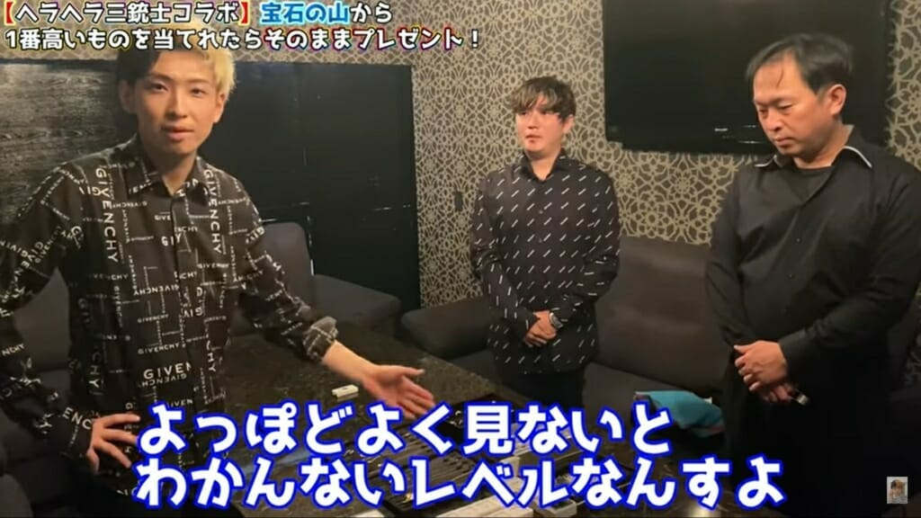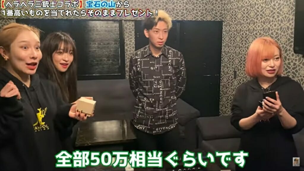 ヒカルは「一番高い宝石・本物のダイヤを見つけたらプレゼント」を企画。挑戦するのはありしゃん、さおりん、まりなのヘラヘラ三銃士。沢山の宝石を前に興奮する3人だが真剣に宝石を選んでいる。