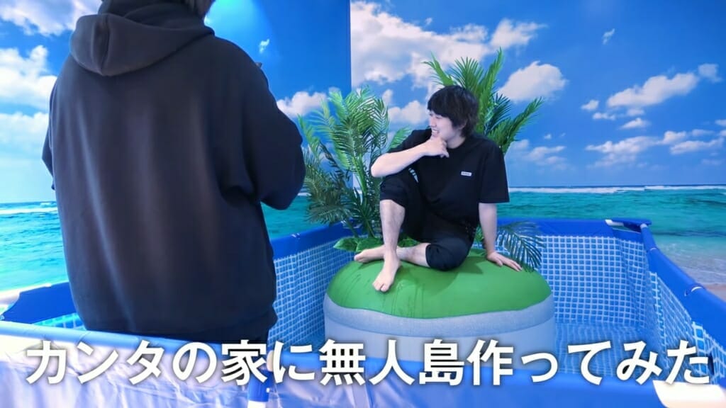 水溜りボンドが楽しみにしていた無人島企画。出来なくなり落ち込んでいるカンタのため、トミーは無人島をカンタの家に作成。カンタの留守中に、無人島を作っていくトミー。