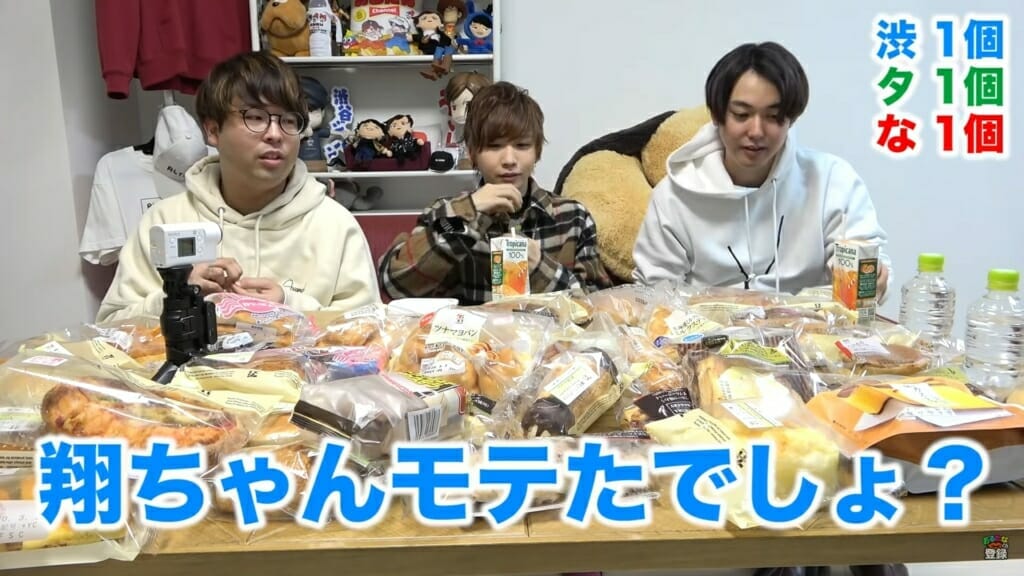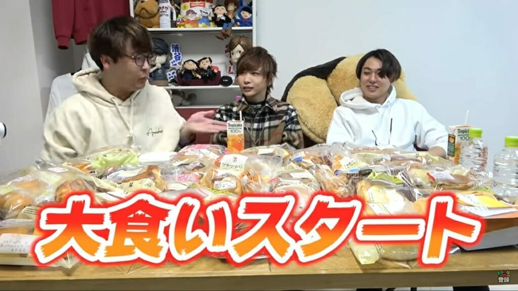おるたなChannelに大食い企画チャレンジをしているタケヤキ翔が出演。初コラボ、初共演となっている。3人はコンビニパン1㎏食べきれるのかに挑戦。