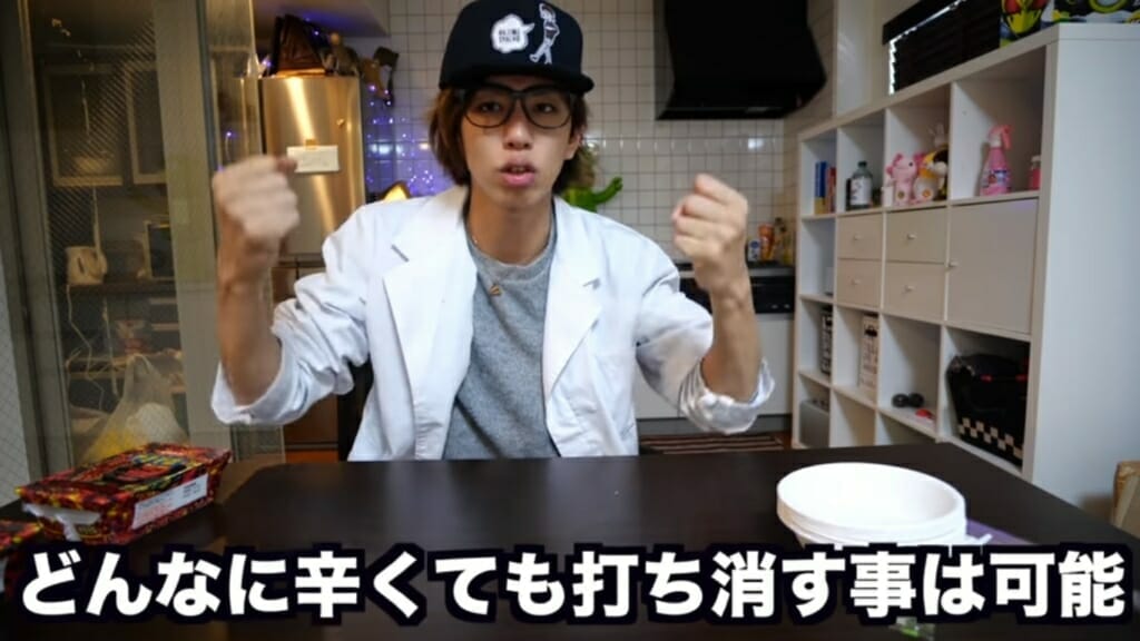 はじめしゃちょーは、ケチャップ、生卵、ごまドレッシング、マヨネーズ、ご飯(白米)、プリン、シュークリーム、ハチミツ、メイプルシロップの9種類の食材と調味料を試した。辛さを一番抑えるのはハチミツ、味ならケチャップか生卵が最適という検証結果になった。