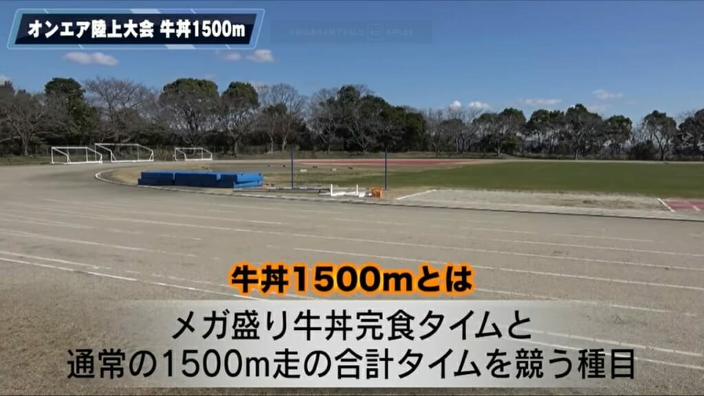 東海オンエアのりょう、てつや、としみつ、ゆめまるが「メガ牛丼を完食してから1500m走」に挑戦。実況は虫眼鏡が担当している。スムーズに完食し走り始めるメンバーに好記録も続出。