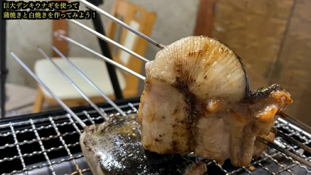 電気をウナギを白焼きと蒲焼にしたきまぐれクック。身は食べるとホロホロ崩れるが、油はウナギと違い水っぽいと感想を述べた。