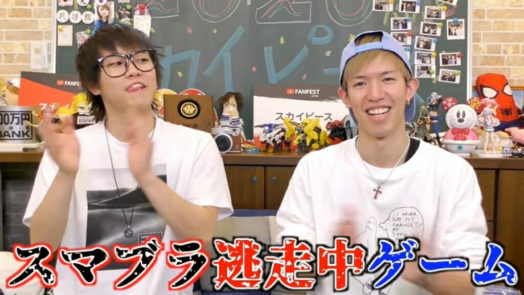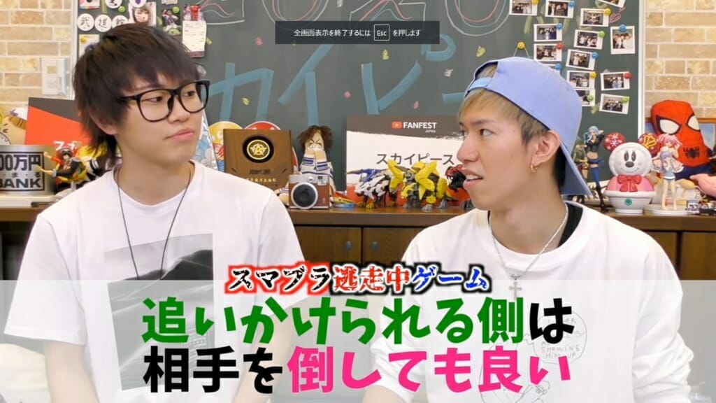 スマブラをよくしているスカイピースの二人。いつも勝つのはテオとのことで、じんたんは新しいルールを考案。人気テレビ番組「逃走中」をスマブラで行うというもの。戦いではなく逃げることに焦点を当てた新しいスマブラの勝負方法だ。
