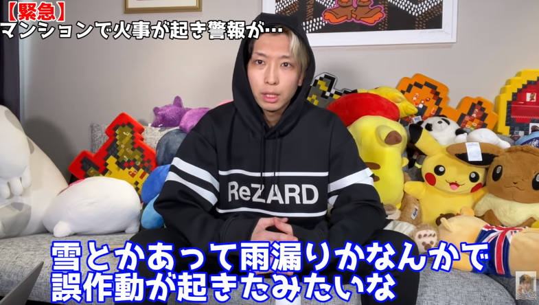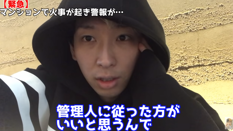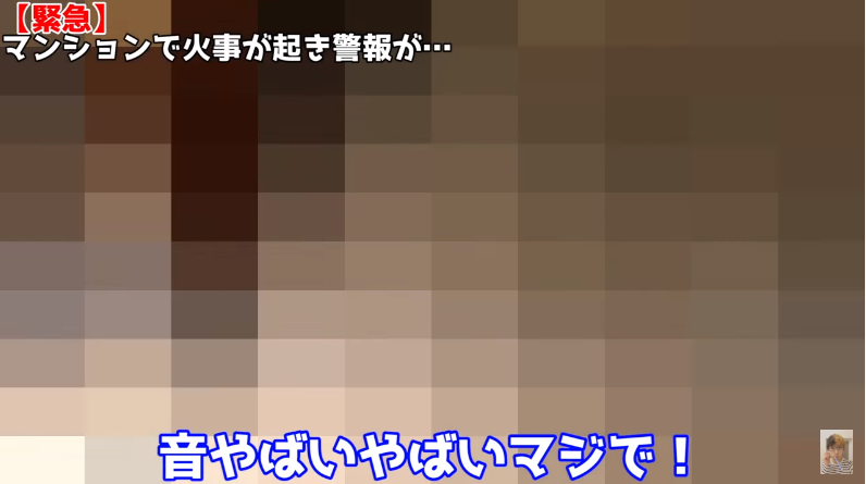 動画冒頭では、火災警報がけたたましく鳴り響く中ヒカルがマンションのロビーまで避難する様子が映し出されている。