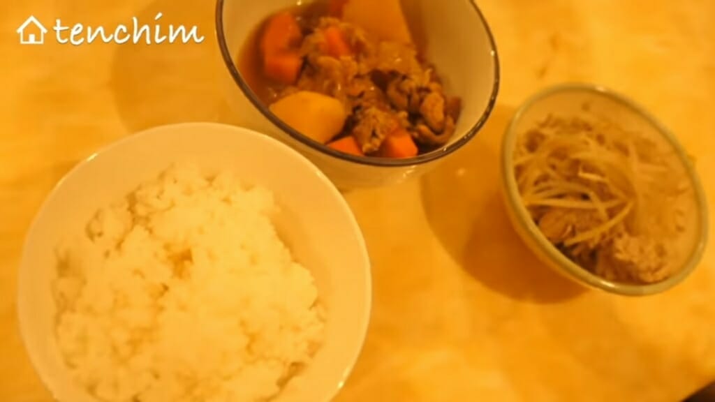 てんちむは、肉じゃがとハヤシライスはウーバーイーツよりも自炊した方がおいしいという持論を展開し、料理作りに挑戦した。料理中のエプロン姿が好評で、「部屋着と合う!」との声がファンから寄せられている。一人での撮影に苦闘しながらも、美味しい肉じゃがと炒め物が出来上がった。