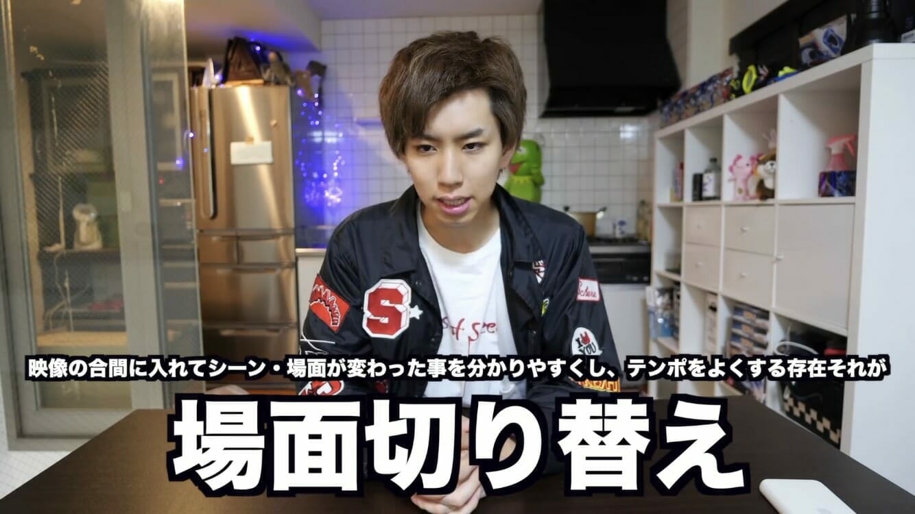 場面切り替え動画はユーチューバーにとって欠かせない技法となっている。シーンやテンポが変わる時、一瞬動画が入ることで酢全に場面を切り替えることができる。テレビでいうCMのような役割をしてくれるのがこの場面切り替え動画だ。