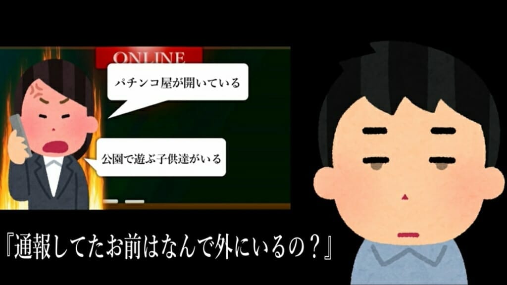 コロナに関する通報が1日に400件以上あることが問題視されている。通報内容も「パチンコ屋が開いている」「公園に人がいる」といった内容で通報している人も外出していることが分かる。