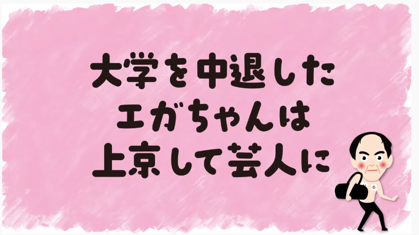 当時を「ものすごく落ち込んで立ち直れなかった」と語るエガちゃん。もともとNさんに合わせるため入学する予定ではなかった大学へ入学したため、失恋後は大学を中退し上京。現在も所属している事務所 大川興業の門を叩いたのだった。