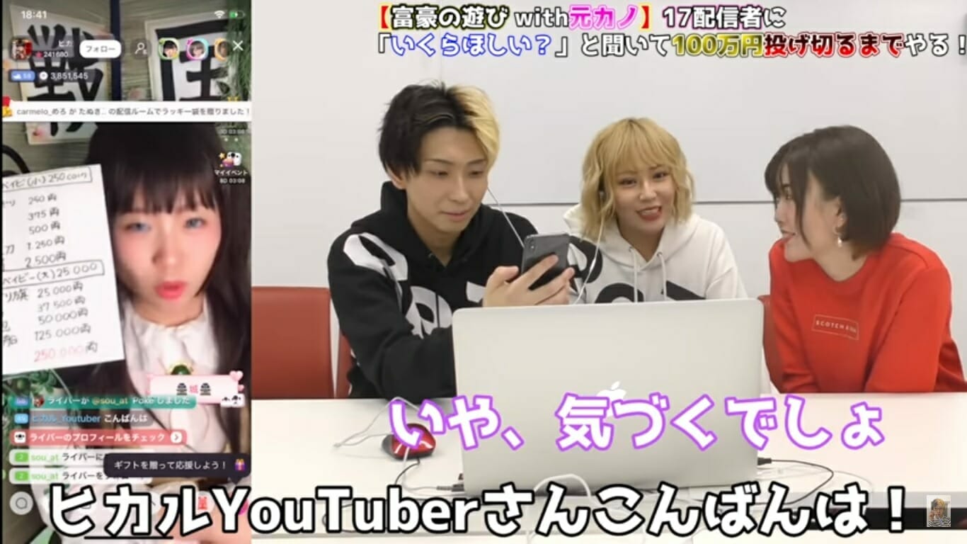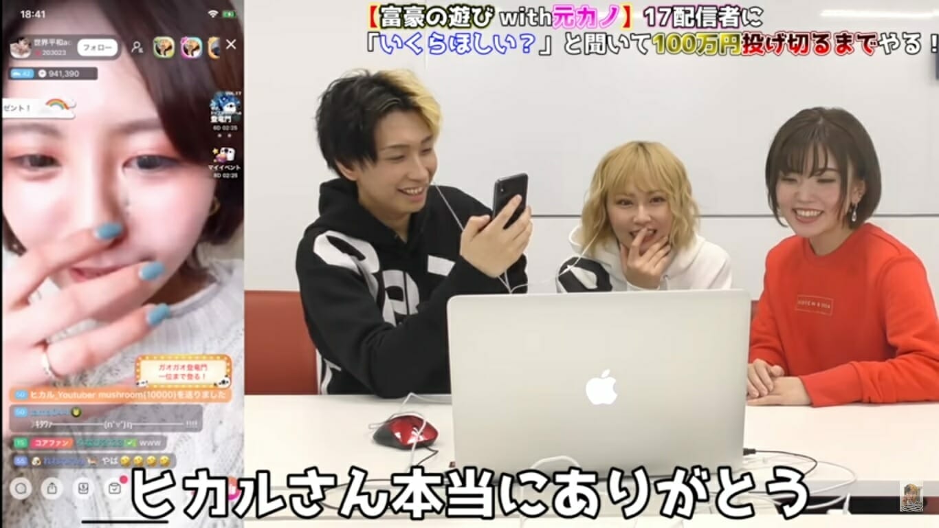 2020年4月14日、会社経営者としても活躍するYouTuberヒカルが「「いくらほしい?」と配信者に聞いて答えた金額だけガチで100万円投げ銭したら感動の展開に…」という動画を投稿した。100万円の予算で17liveの配信者に投げ銭を行った。