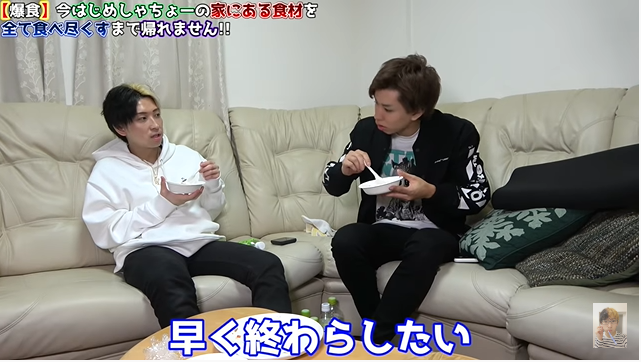 家の中にある食べ物を協力して食べながら雑談するトップYouTuber2人。
