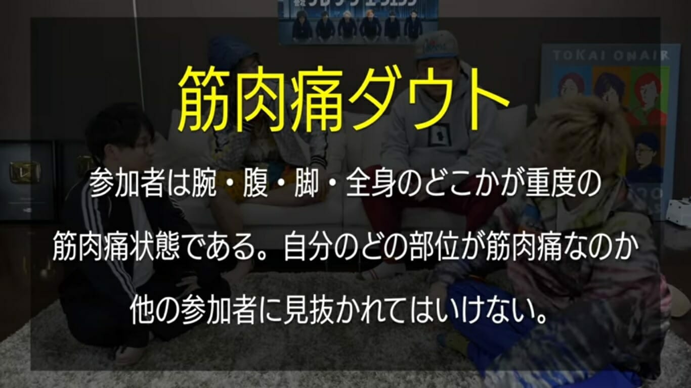 2020年4月19日、6人組YouTuberの東海オンエアが「【頭脳戦&肉体戦】他人の筋肉痛の部位を見抜け!筋肉痛ダウト!」という動画を投稿した。筋肉痛になっている部位を見抜かれないようにする競技に挑戦した。