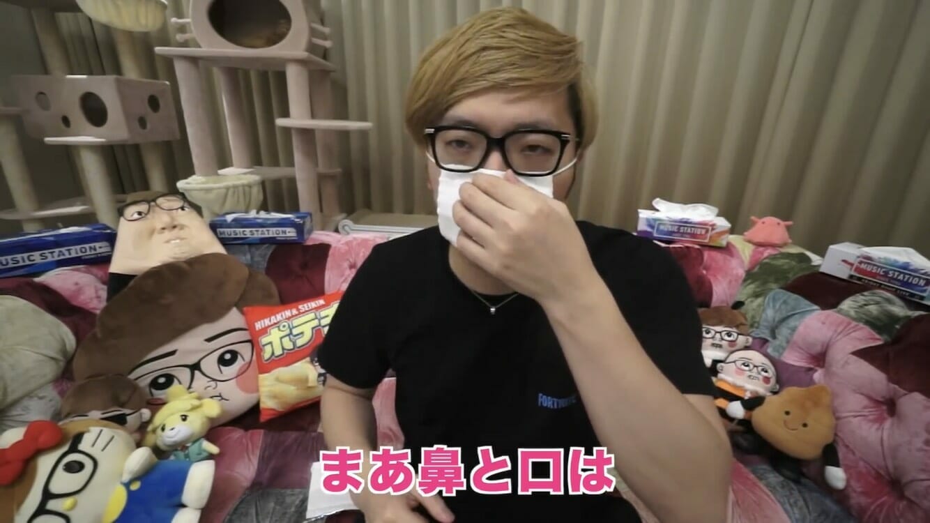 実際にアベノマスクを装着したヒカキン。最初は「やっぱり少し小さいかも(笑)」としながらも、自分の顔が大きめなので、このぐらいが普通なのかな?とした。顎ははみでるものの、鼻と口は最低限隠れているので無意味というわけではなさそうだ。ただ、洗うと縮んでしまうため注意が必要だ。